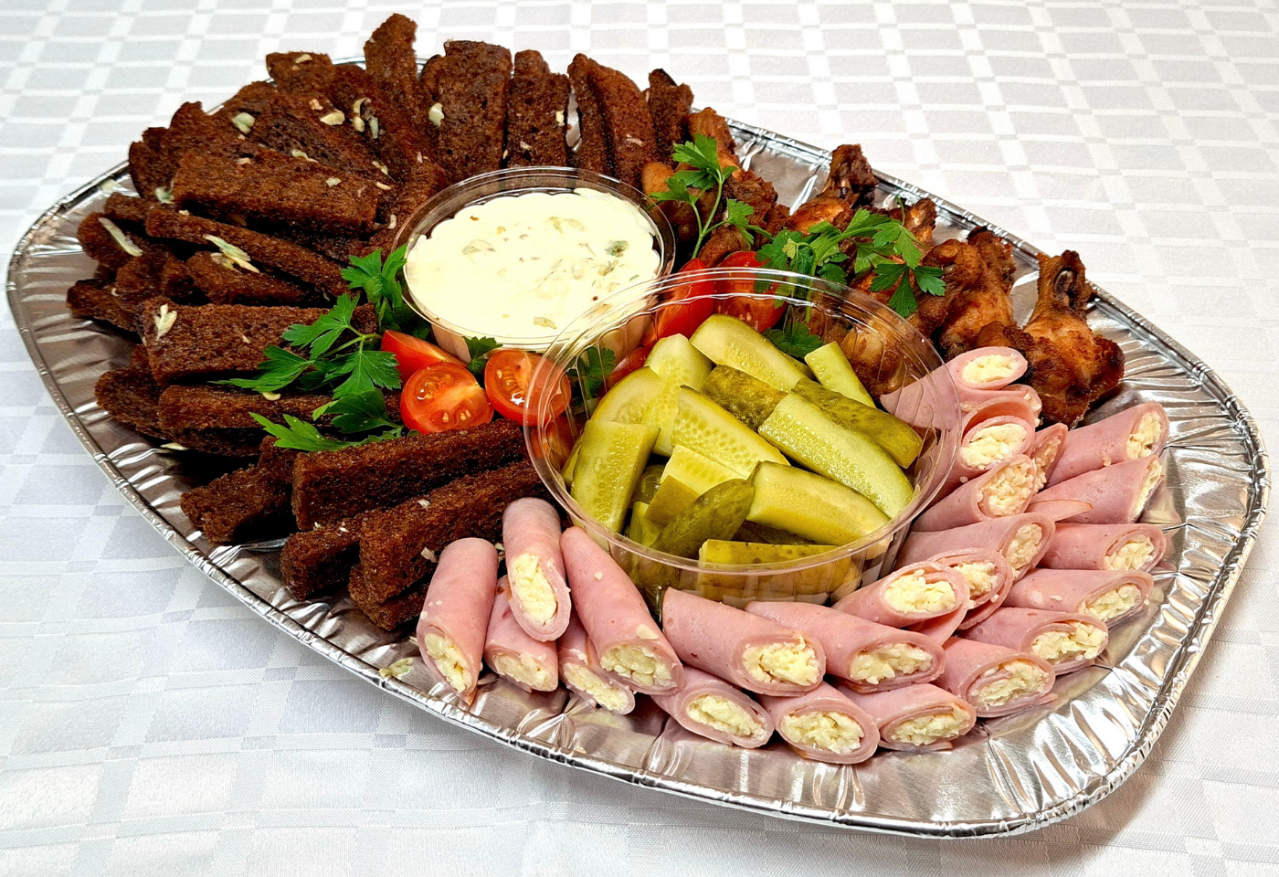 Singirullid 12 tk, küpsetatud kanatiiva õlaosa 400 g, küüslauguleivad 500 g, marineeritud kurk 400 g, küüslaugukaste 200 g. Kaal ca 1,8 kg. Mõeldud 8-10 inimesele.