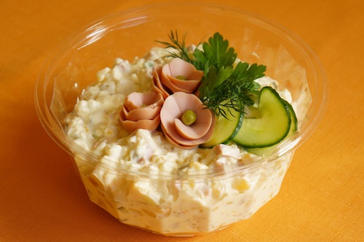 Kartul 45%, vorst 15% (sealiha, vesi, vadakuvalk, tärklis, soja, sool, stabili-saator difosfaat, dekstroos, lõhna- ja maitse-ained, antioksüdant naatriumisoaskorbaat, happesuse regulaator glükoondeltalaktoon, säilitusaine naatriumnitrit), mar.kurk, muna, hapu-koor, majonees (vesi, õli, maisitärklis, suhkur, lõssipulber, sinepipulber, paksendaja, munapulber, happesuse regulaator, äädikhape, toiduvärv b-karoteen, E211), sool.